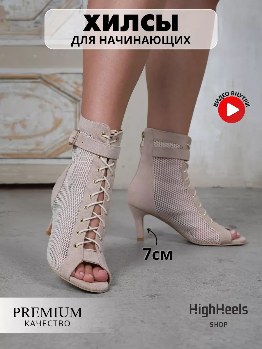 Ищите качественные хилсы для танцев или туфли для бачаты? Обратите внимание на эти туфли для танцев high heels. Они имеют устойчивые каблуки - 7 см, выполнены из эко замши премиум качества, которая отличается высокой износостойкостью. Высота каблука всего 7 см отлично подойдет для начинающих танцоров хиллс или продолжающих танцоров бачаты, они очень комфортны и ноги совсем не устают. Ваша стопа будет надежно зафиксирована благодаря шнуровке и ремешку. А молния с замочком сзади значительно облегчает процесс обувания, не нужно каждый раз завязывать завязки. Подошва у этих бежевых хилзов жесткая и рифленая, на ней удобно делать повороты и вращения. Ботильны для танцев имеют светлую подошву и не оставляют следов на паркете. Сеточка не даст вашим ножкам вспотеть во время самых интенсивных танцевальных тренировок. Сетка у данной модели плотная и отлично держит ногу. Данная модель хиллс пользуется популярностью у танцовщиц таких современных направлений, как хай хиллс, vogue, социальные танцы - сальса, бачата, кизомба, латина, стрип пластика и других. Если вы ищите туфли для бачаты, социальных танцев, кизомбы, то обязательно присмотритесь к этой модели, она невероятно удобная, практичная и красивая. Наш бренд специализируется на обуви high heels - мы предлагаем широкий выбор комфортных ботильонов на разной высоте каблука, выполненных из самых качественных материалов. Эти туфли также можно использовать не только для танцев, но и в обычной жизни. Светлые босоножки в сеточку на каблуке прекрасно сочетаются с вечерним платьем, с брюками и даже с джинсами. Ботильоны с открытым носом с завязками на шпильке всегда в тренде и выглядят максимально элегантно.